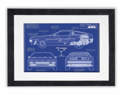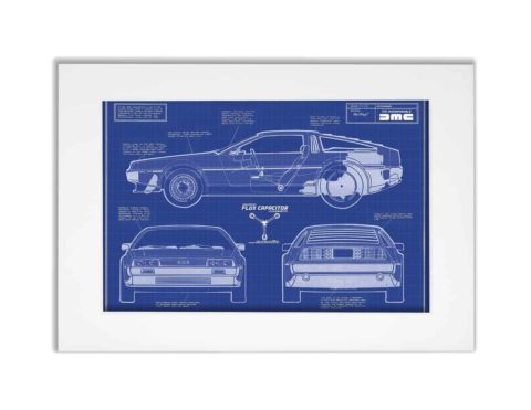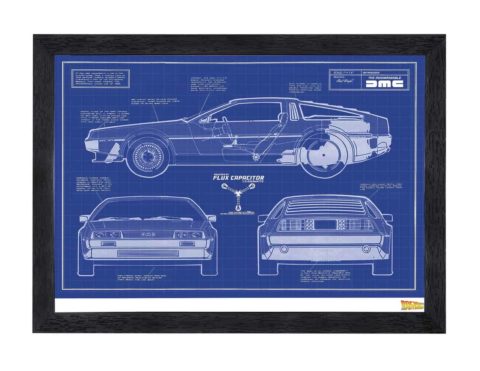 Here we have a DeLorean printed poster with a difference. It depicts blueprint plans for the DeLorean, complete with its Flux Capacitor. The DeLorean is illustrated from the side, front and back, showcasing both external and internal features. Each detail is then explained with small blocks of white text.