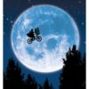 A magical and iconic scene from movie history is used to create this stunning E.T. art poster. It shows the dark night sky above a forest, with a huge full moon and surrounding stars illuminating the centre of the piece. In shadow, a little boy rides his bike through the air with E.T. sitting in the bike’s basket, wearing a sheet to hide.