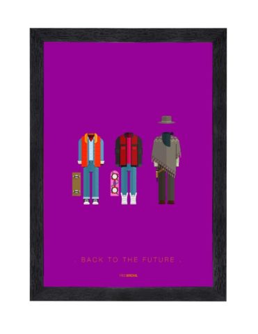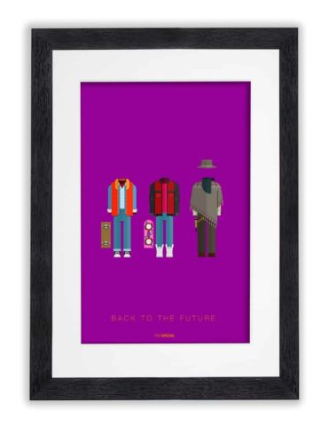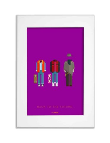 Birchal’s signature minimalist style does not skimp on the details. Each outfit is easily recognisable, instantly conjuring images and scenes from the films for the viewer. The luscious purple background creates a contrast with each outfit and serves to grab the attention of the viewer. This could be displayed prominently in your living space, or given as a colourful Back to the Future poster for fans.