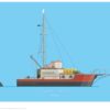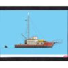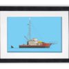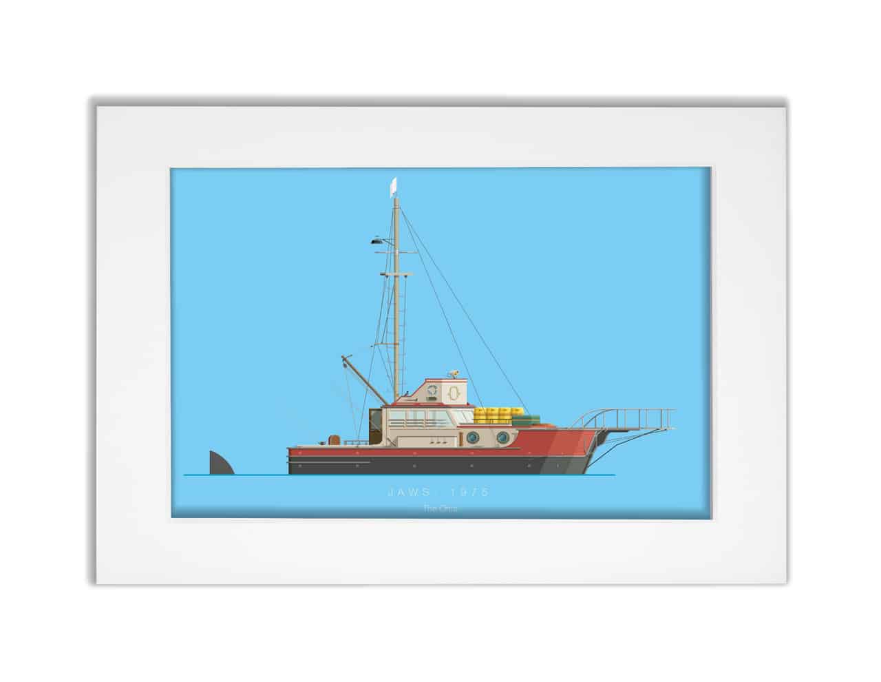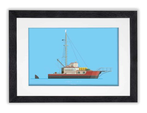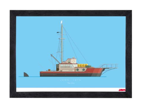 Fred Birchal has created his own Jaws 1975 movie printed poster. The focal point is an illustration of the boat from the movie against a sky blue backdrop. Each detail of the boat is included, and this intricacy will delight fans of the film who will be able to recognise each element.