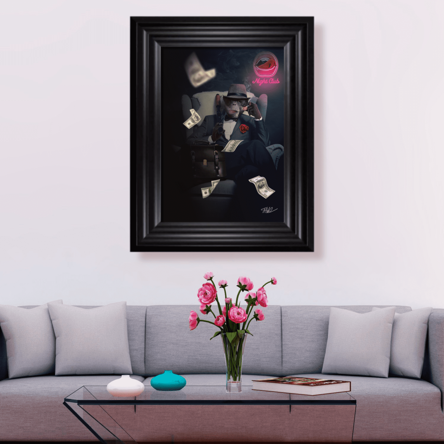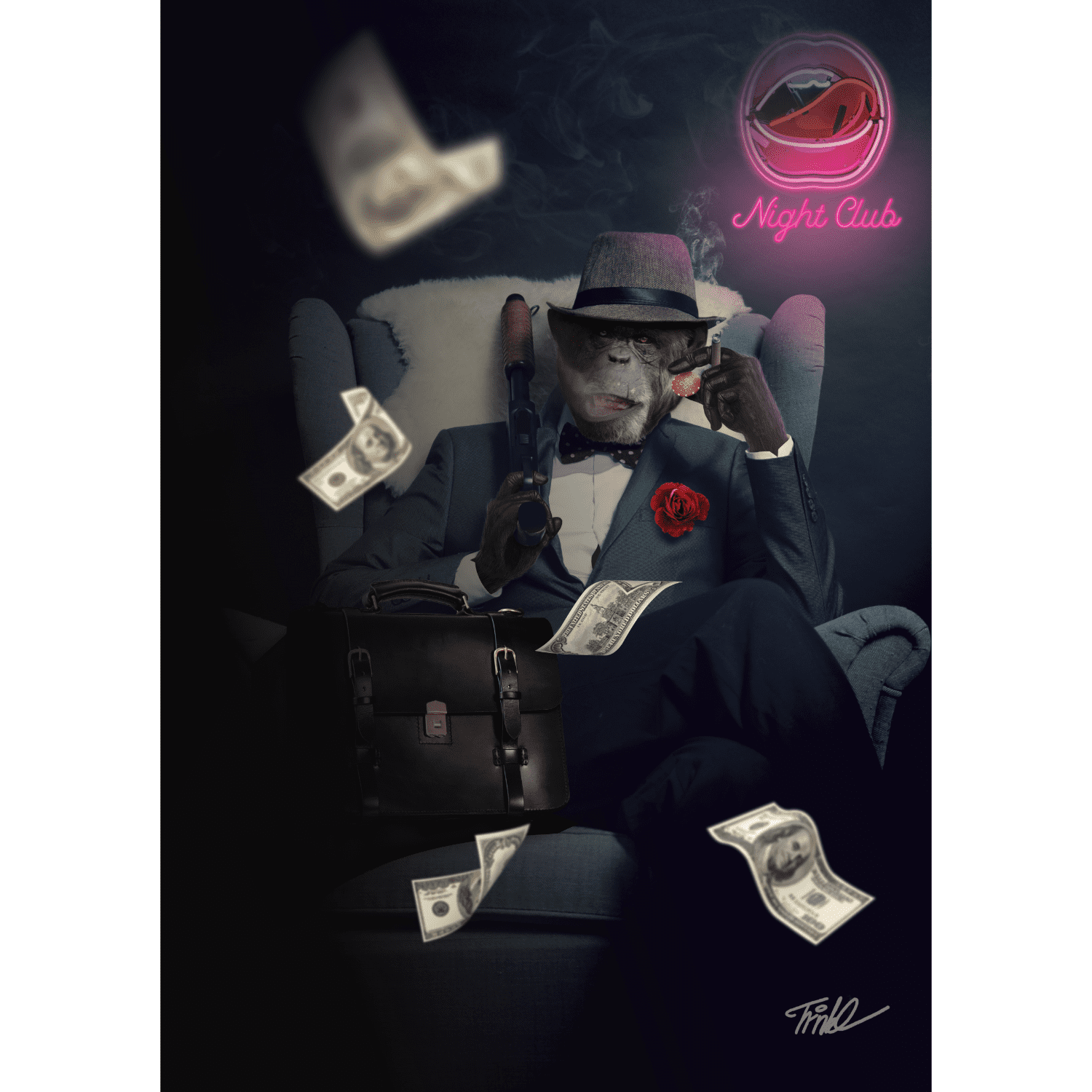 This portrait takes elements of everything we associate with the mafia and gangster culture. Pictured is a monkey lounging on an armchair, beneath a nightclub neon sign. Smoke streams from a cigar in a hand that’s also holding a casino chip. The other hand holds a weapon, and money is falling all around him.