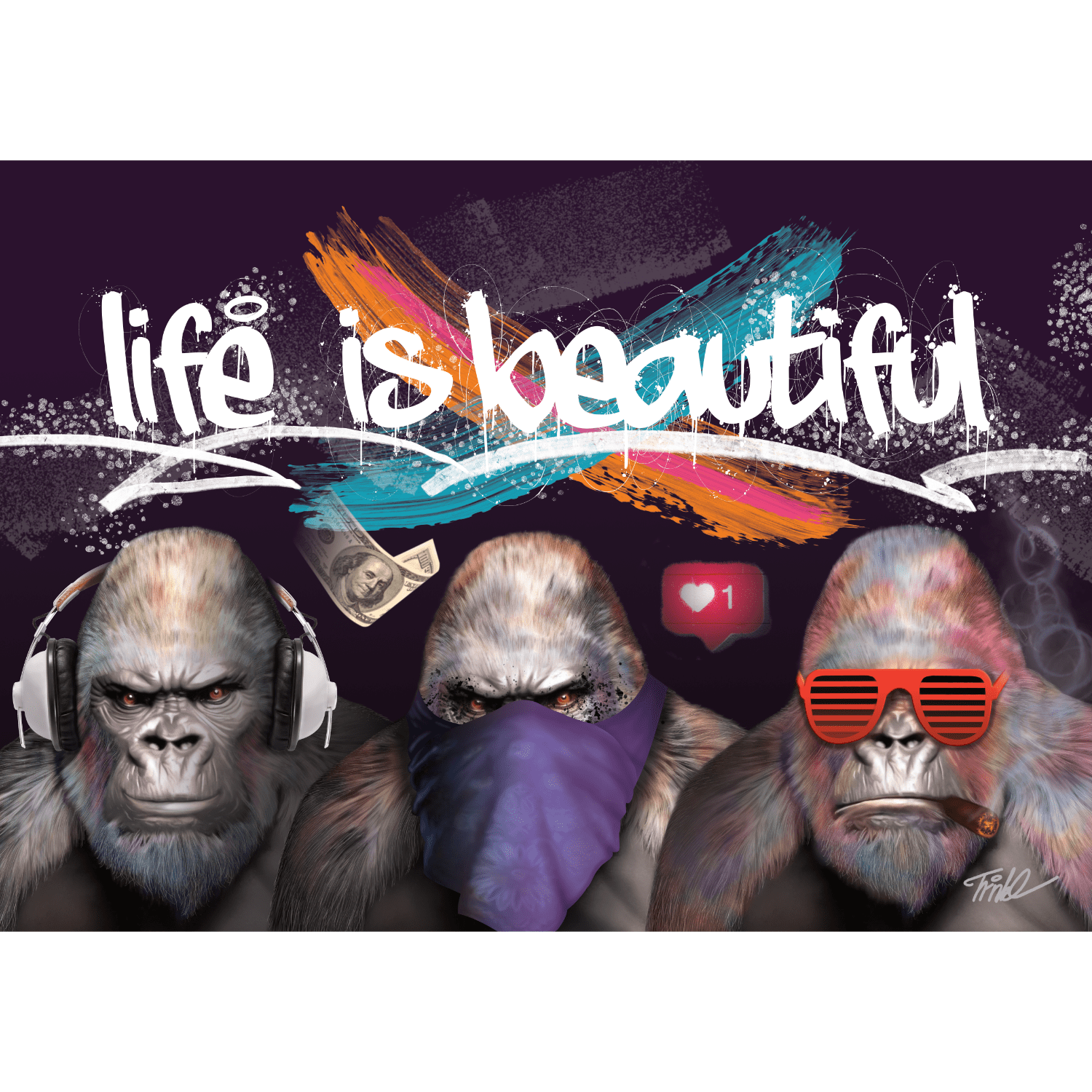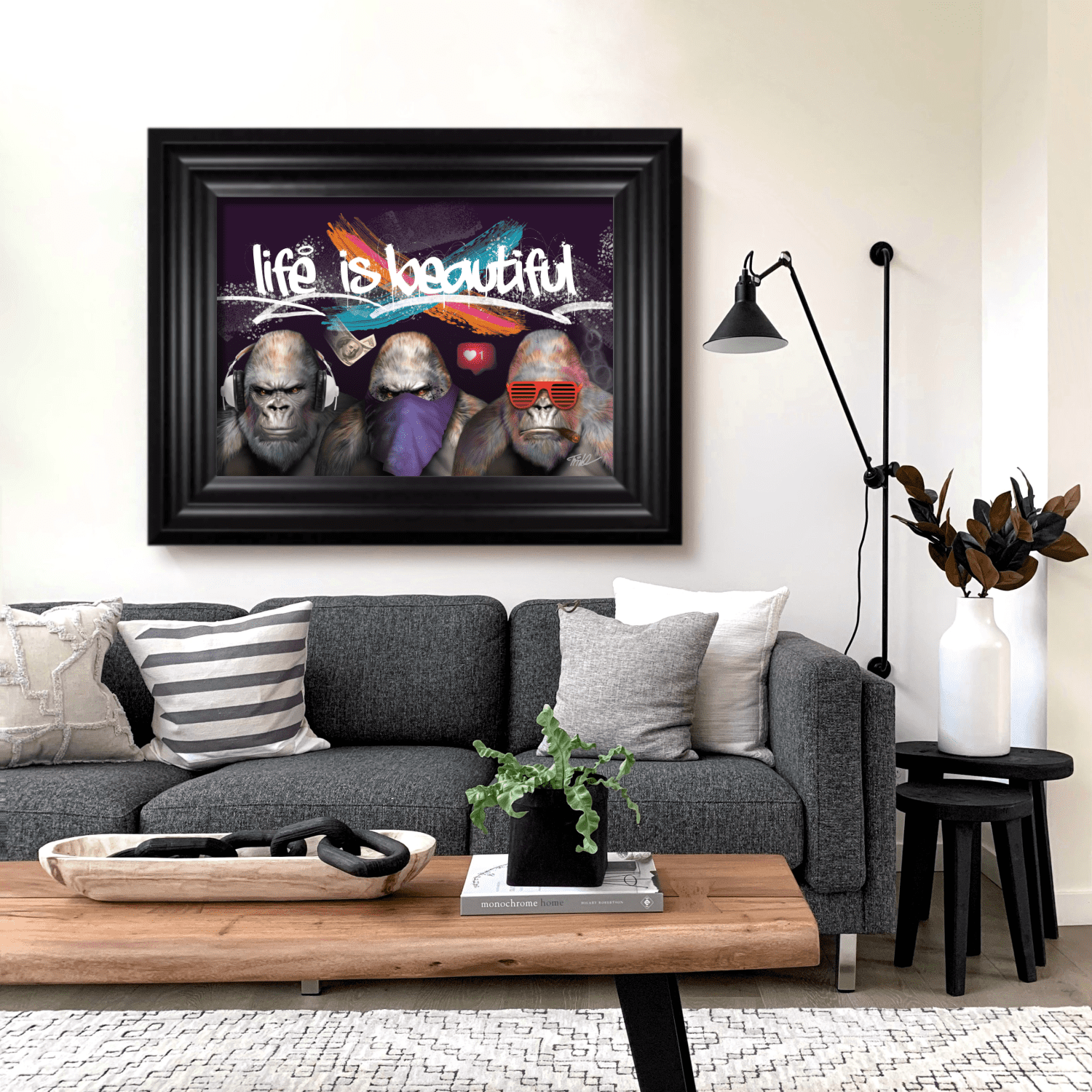 At the forefront of this urban wall art print are 3 gorillas. Each gorilla represents one of the classic idioms, Hear No Evil, Speak No Evil and See No Evil. For Hear No Evil, the gorilla is wearing headphones. For Speak No Evil, the gorilla wears a bandana scarf over the bottom half of his face. And for See No Evil, the gorilla has sunglasses as eyewear.