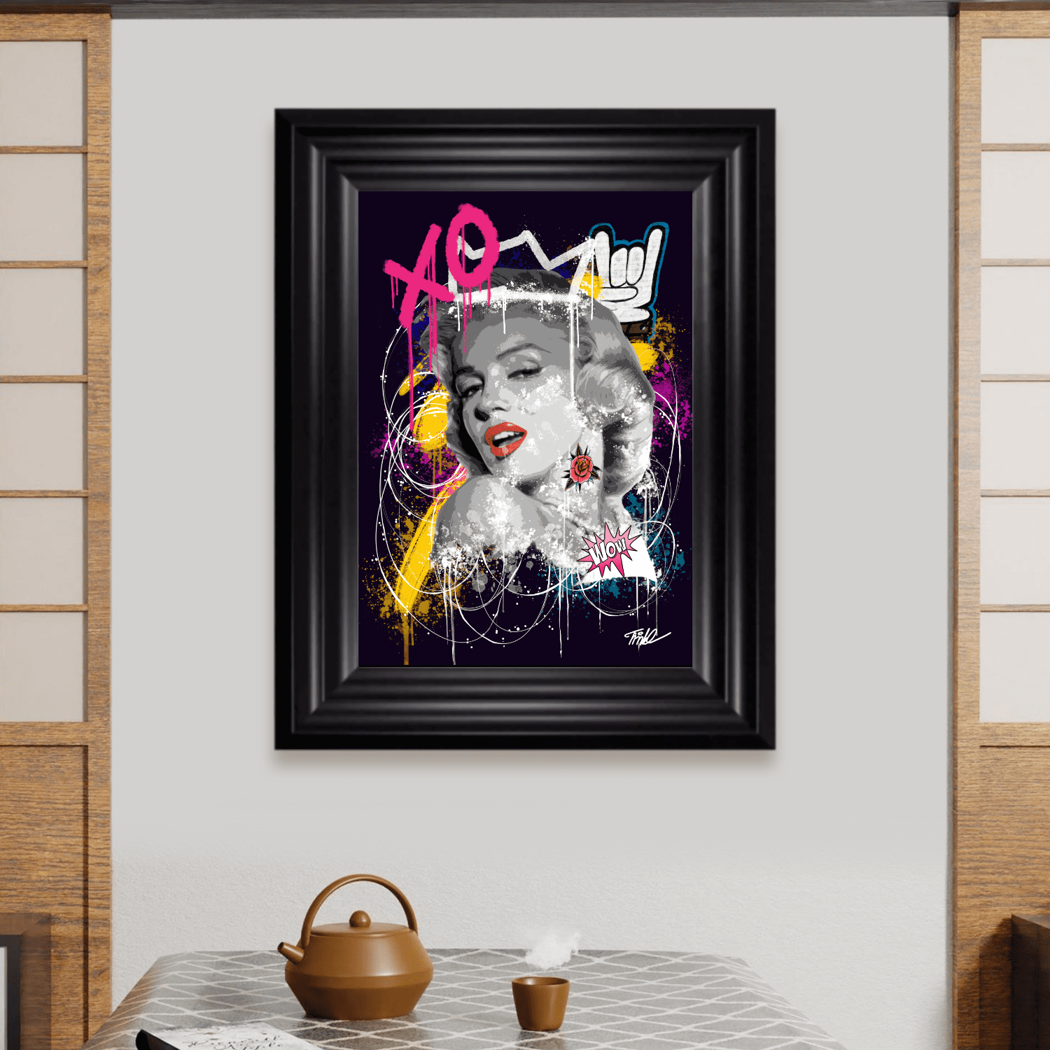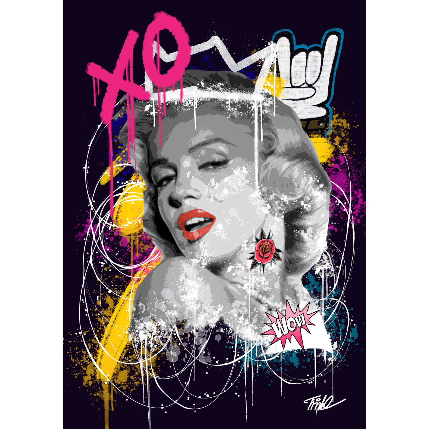 Her vintage style is captured in the monochrome portrait of her that is the central focal point of this urban wall art print. Her bright red lips stand out against the grayscale and there is a white spray paint crown at the top of her head. The background consists of different textures of graffiti with heavy street art influences. On Marilyn’s neck is an old-school vintage tattoo of a flower and there is a graphic design ‘WOW’ at the forefront of the image. This combination of vintage style and urban art is fascinating and makes for a completely unique portrait.