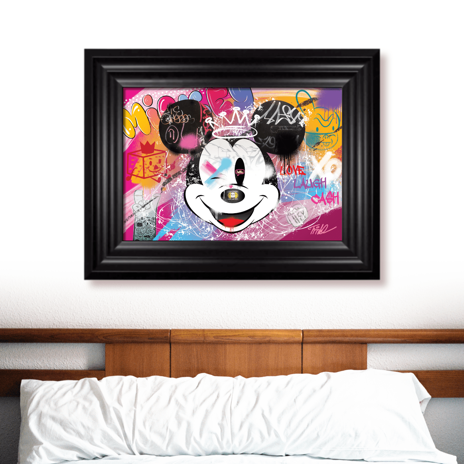 Surrounding Mickey is spray paint cartoon characters and graffiti sayings. This takes on a slightly more sinister undertone with well-known phrases being subverted, such as “Live Laugh Cash” and “Smile Now Die Later”. The spray paint and mix of bright yellows and pinks make it a captivating urban wall art print. But the message goes deeper than the surface, inviting the viewer to question their assumptions and values.