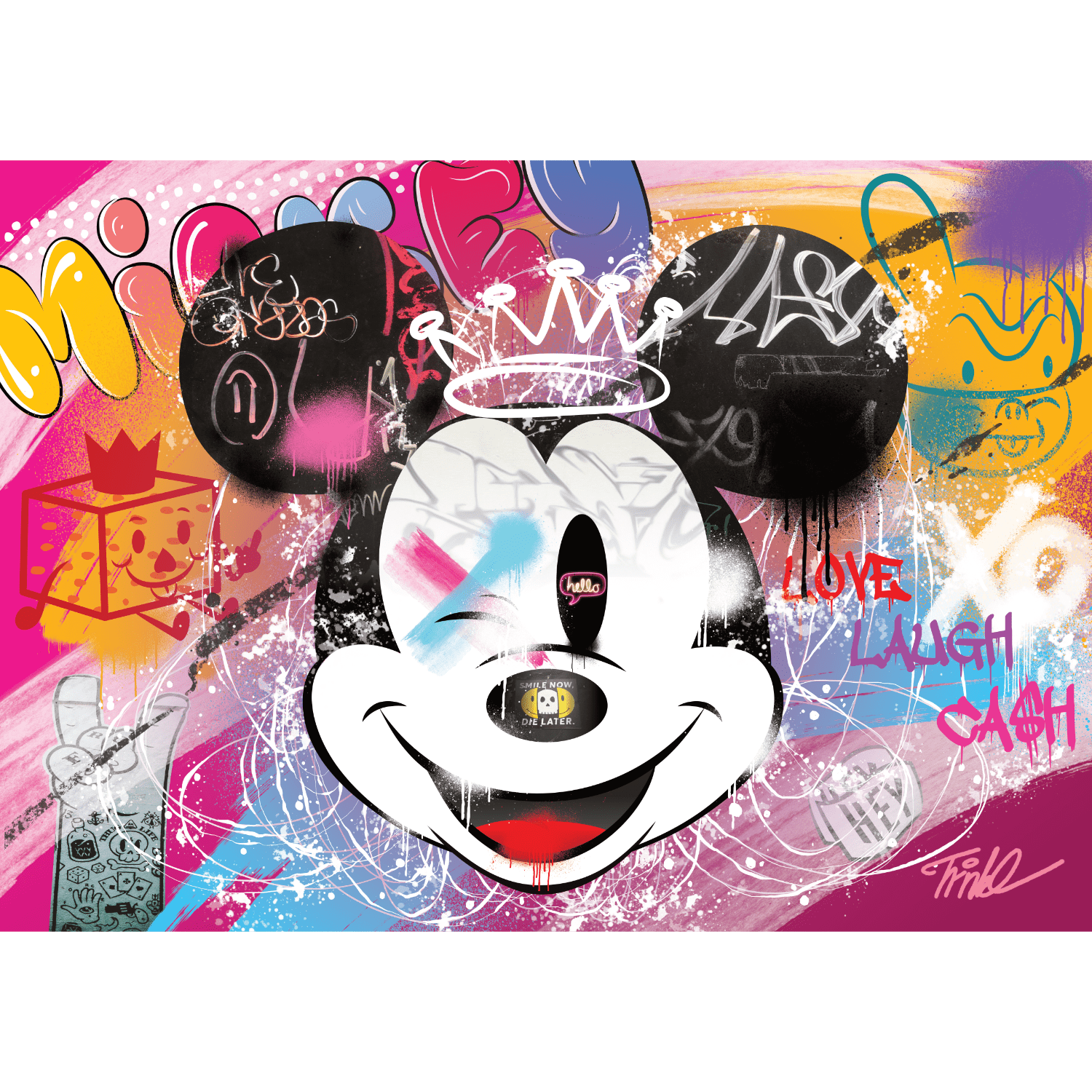 Mickey Mouse is a Disney cartoon icon. Debuting in the 1920s, Mickey Mouse has had a place in the hearts of children for generations and is one of the most recognisable cartoon characters of all time. Here, Trinkl gives Mickey a street art twist with a graffiti crown and his name in bright bubble writing in the background of the portrait.