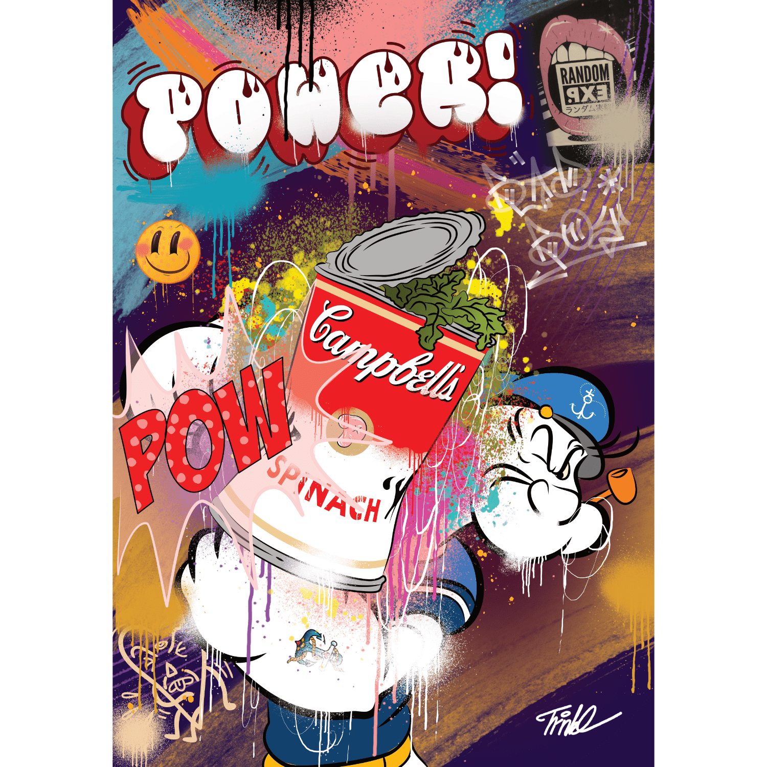 Trinkl creates a street art aesthetic, with Popeye’s vintage tattooed arm and the use of Campbell’s as a pop art icon. The background consists of deep purple, bright blue and orange paint strokes along with graffiti and spray-painted imagery. As a piece of contemporary art, it blends elements from multiple genres to create a statement image for your wall.