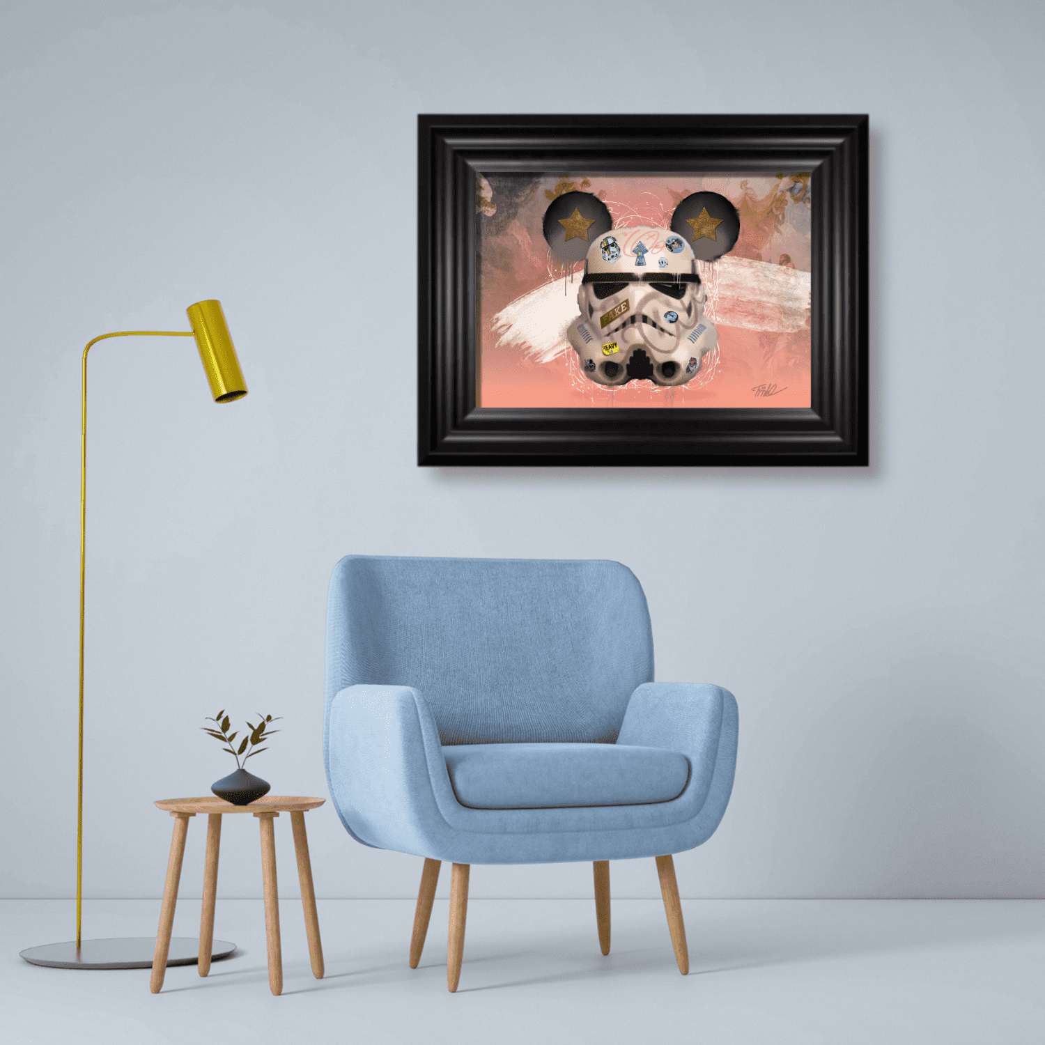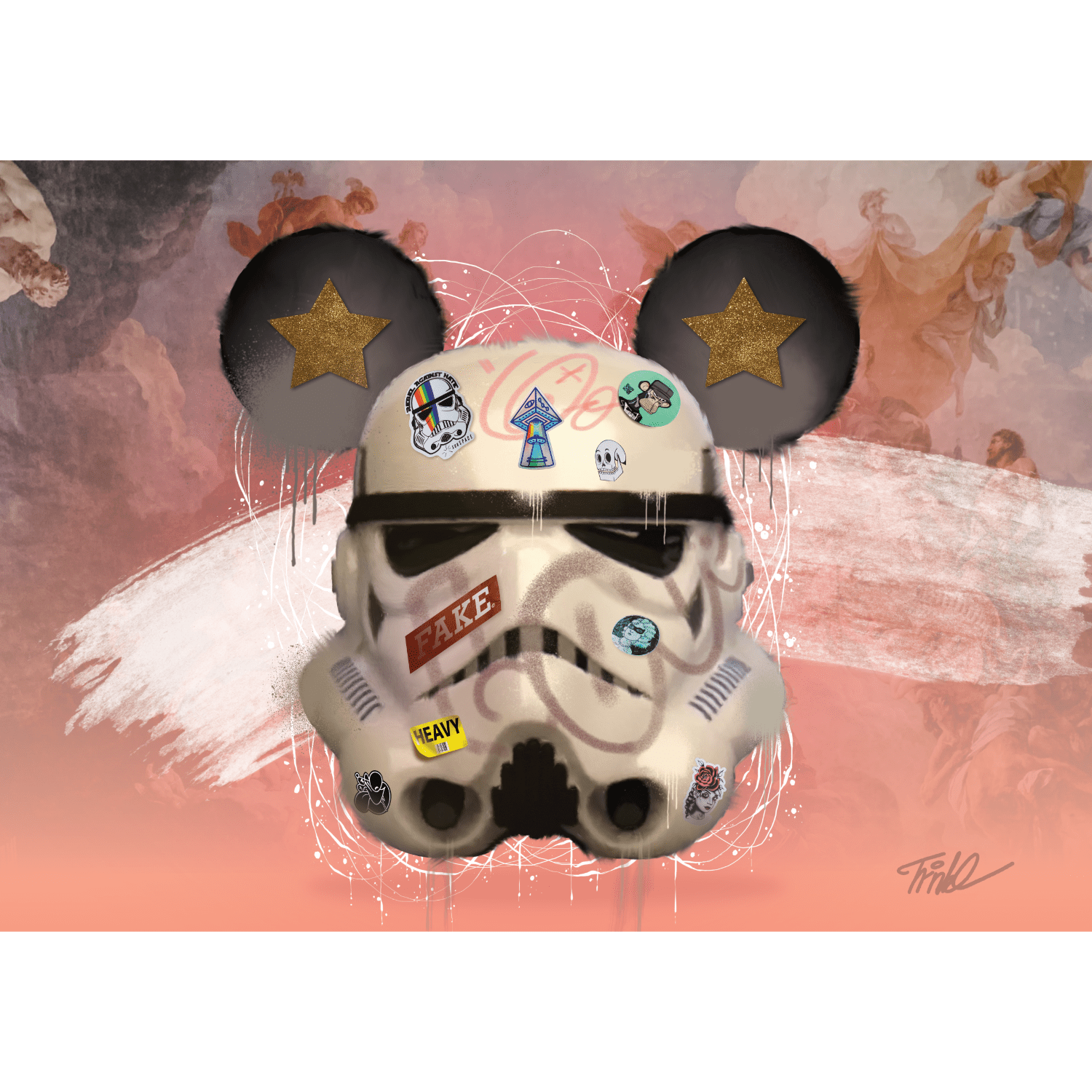 This stormtrooper has some meta stickers on his helmet, most notably one of a stormtrooper helmet. It states “Rebels against hate”, with a rainbow streak through the helmet. The background is a faded salmon colour, reminiscent of the sands on Tattooine. It fades to reveal Renaissance, classical art at the back of the image.