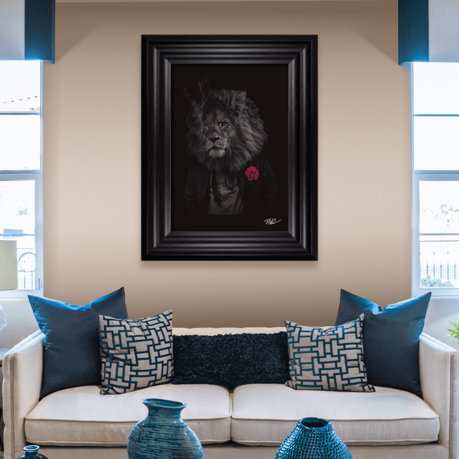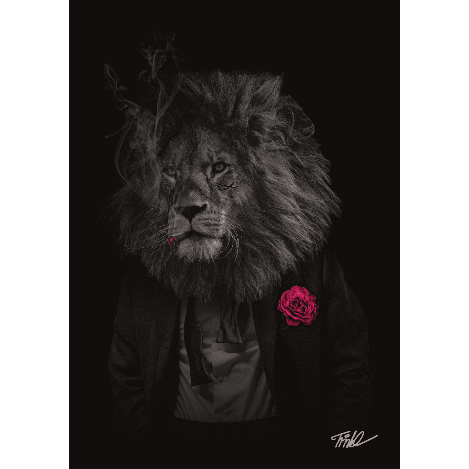 The image is entirely black and white, except for the detail of a red rose buttonhole and the red embers at the end of his cigar, from which smoke is streaming upwards. This lion is clearly king of the pride as portrayed in this urban wall art print.